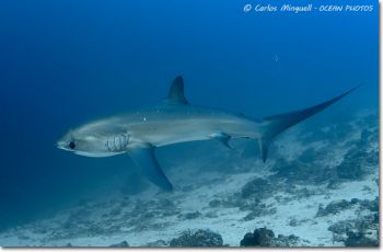 Este sitio es Malapascua, que une al clásico repertorio de macrobichos y corales la oportunidad de disfrutar de este precioso animal. Digo oportunidad, porque en el mar pocas cosas están garantizadas, pero lo cierto es que de 4 buceos que hicimos en Monad Shoal, en los 4 vimos al menos un zorro y en 3 pude fotografiarlos con mayor o menor fortuna. Monad Shoal es una amplia meseta sumergida a cuyas estaciones de limpieza acuden los zorros al amanecer, abandonándolas tan pronto crece la luminosidad del día. No parece que los enormes ojos de este tiburón de aguas profundas estén preparados para la luz de las aguas someras, así que prepárate para pegarte un buen madrugón cuando vayas a por ellos. Otra cosa que chocará a cualquier fotosub es la rotunda prohibición de usar el flash para retratarlos, algo que me parece justificado con este magnífico animal (Me viene a la memoria cuando propusieron para las Islas Medas la misma medida, lo cual me pareció una auténtica barrabasada). Es una pena tener que fotografiar al zorro solo con luz natural, a primera hora del día y a 30m de profundidad, aunque la calidad del agua y la abundancia de arena clara echan una mano y se consiguen imágenes mejores de lo que me esperaba. También es verdad que es una de las pocas situaciones en las que he echado de menos disponer de una cámara con sensor full frame para poder subir la sensibilidad a lo loco.